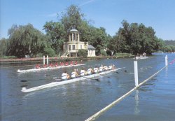 Originally it was a two day event with the course being from above Temple Island to the bridge. In 1906 it became a four day regatta followed in 1924 by the cutting of the new one and a half mile straight course. In 1986 the regatta was extended to five days to enable several events to be included, with the Grand Challenge Cup for eights being the most prized trophy. The races now start from Temple Island and end by Phyllis Court. The course takes approximately seven minutes to cover, so that most days there are two races taking place on the course with 5 minutes between each start. |