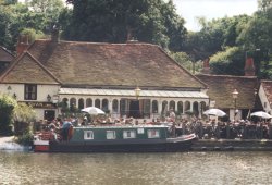 Just upstream of the lock is one of the fairly rare pubs found with riverside frontage.There is space for two or three boats. The Swan is an old establishment dating from 1642. In the days when barges carried goods along the river part of the pub was used as a grain store. Now it's a popular venue during the warm summer months with people enjoying a drink and a meal as they watch the activity on the river.